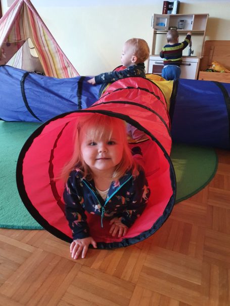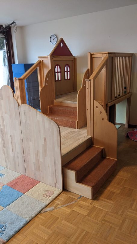 Der große Gruppenraum ist unser Hauptdarsteller. Hier finden unser Morgenkreis und unsere Musikeinheiten statt, es gibt eine Hochebene, Spielzeugregale, Spiegel, eine Spielküche, Bewegungsbausteine und ganz viel Platz zum Toben und Spielen.
