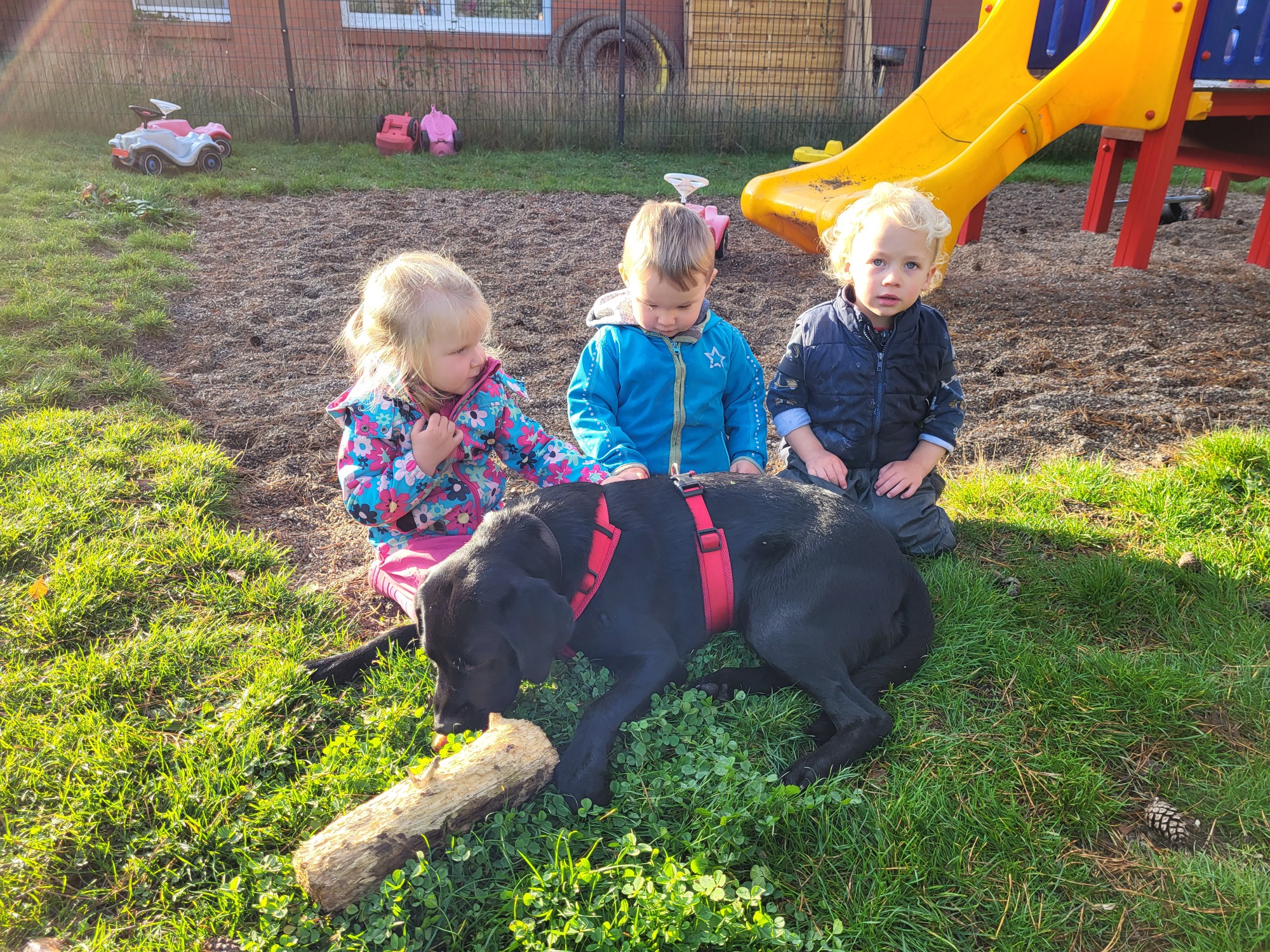 Bewegung an der frischen Luft wird bei uns ganz GROSS geschrieben. Unser weitläufiger Garten bietet dazu reichlich Gelegenheit und erstreckt sich rund um eine große Kiefer, die im Sommer Schatten spendet. Ausgestattet mit einem altersgerechten Klettergerüst mit Rutsche, einer großen Sandkiste, einer Schaukel und sogar einem kleinen Rodelberg sorgt er für jede Menge Spielspaß im Freien. Die Hühner unserer freundlichen Nachbarn haben ihren Auslauf direkt angrenzend und können von uns beobachtet und auch mal gefüttert werden.