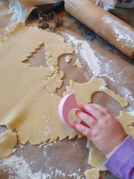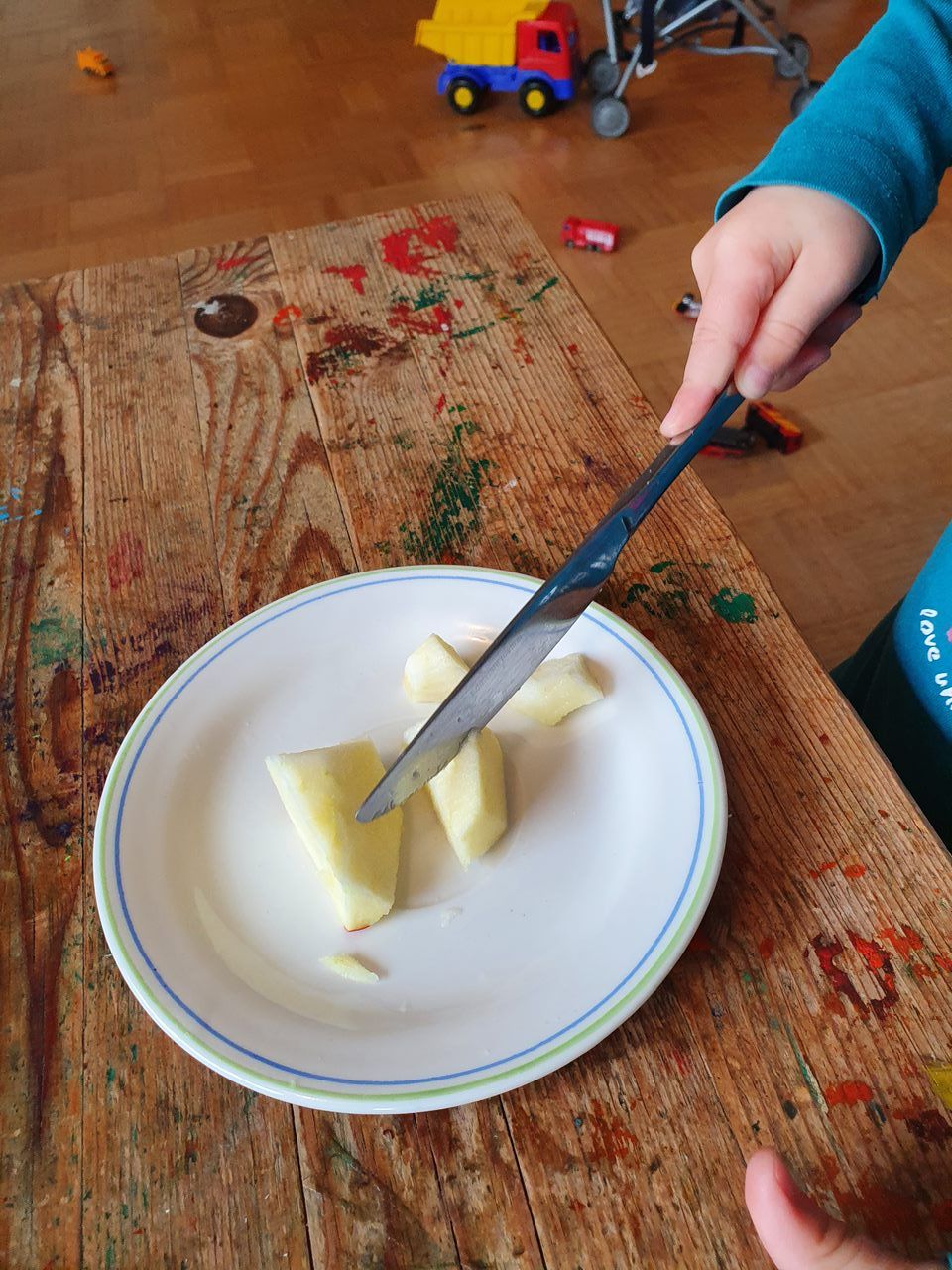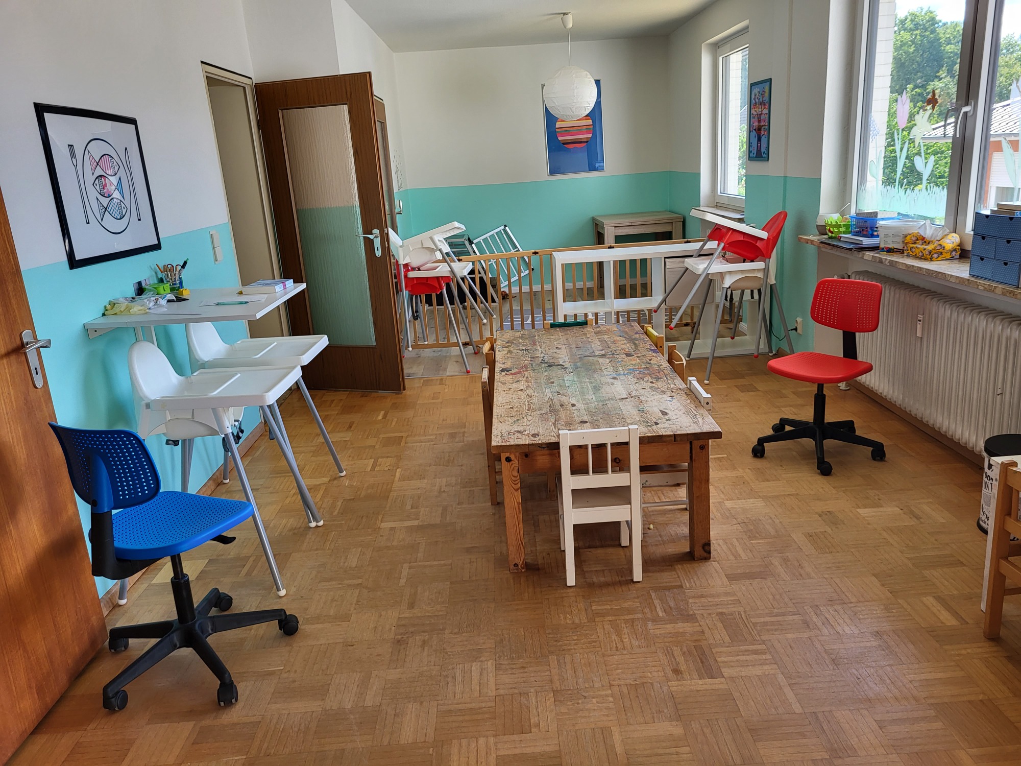 Unser Esszimmer kann etwas ganz Besonderes – es besitzt eine Zaubertür, die in der Wand verschwinden kann. So können wir je nach Bedarf einen geschlossenen Raum zaubern oder das Zimmer zum Gruppenraum hin öffnen. Im Esszimmer nehmen wir gemeinsam das Frühstück und Mittagessen ein. Wir nutzen den großen Tisch aber auch hin und wieder zum Malen oder zum Basteln, zum Backen oder Gemüse schneiden.