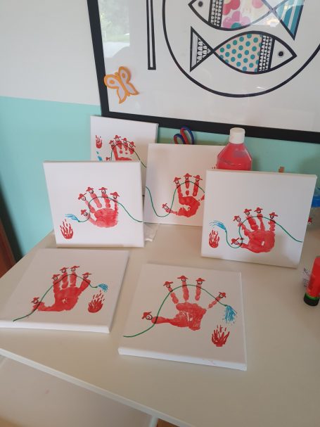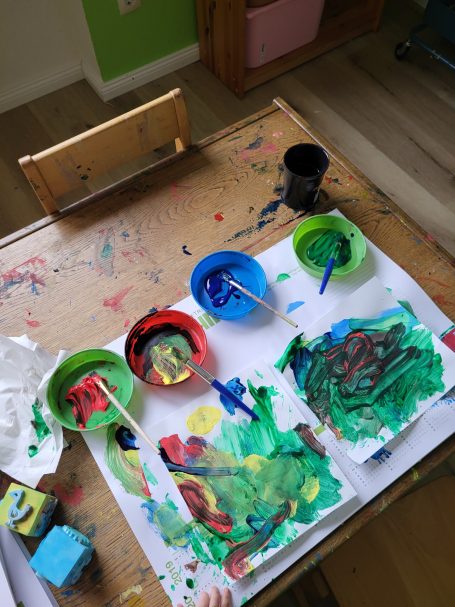 Denn in Kindern steckt ganz viel kreative Schaffenskraft – das erleben wir jeden Tag. In unserem Atelier können wir uns nach Herzenslust mit Farben, Tonmassen, Kleister, Stiften und anderem Kreativmaterial austoben. Wir matschen und schmieren, stempeln und walzen, kleben und kleistern. Dabei geht es (fast) nie um ein vorzeigbares Ergebnis. Im Fokus steht allein der Schaffensprozess. Das genussvolle haptische Ausprobieren der unterschiedlichen Materialien trägt dazu bei, durch positive Erfahrung die Selbstwahrnehmung und Selbstwirksamkeit des Kindes zu stärken.