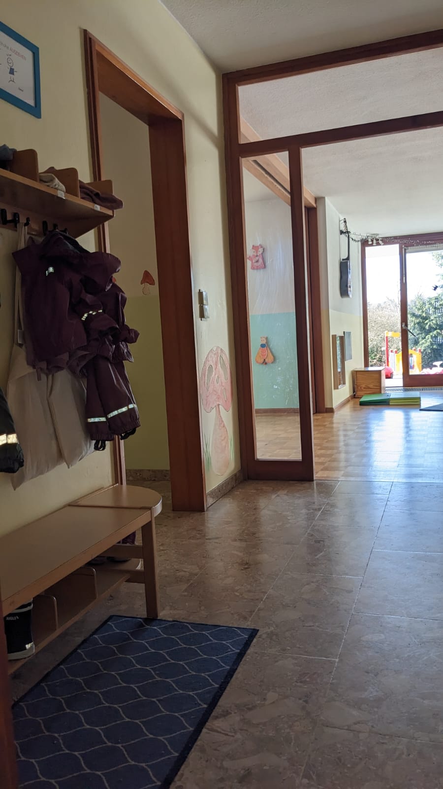 In unserem großzügigen Flur empfangen wir morgens die Kinder. Hier hat jedes Kind sein eigenes Garderobenfach und eine Tasche für Wechselkleidung und persönliche Dinge. Stabile Bänke helfen beim An- und Ausziehen.