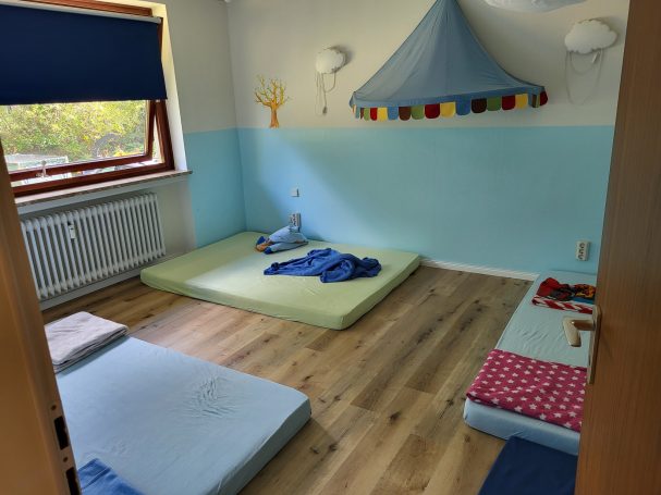 Im Schlafzimmer stehen alle Zeichen auf Ruhe und Gemütlichkeit. Auf großen Matratzen machen wir es uns für den Mittagsschlaf bequem. Das Verdunklungsrollo vor dem Fenster sorgt auch an sonnigen Tagen für entspannten Schlaf.